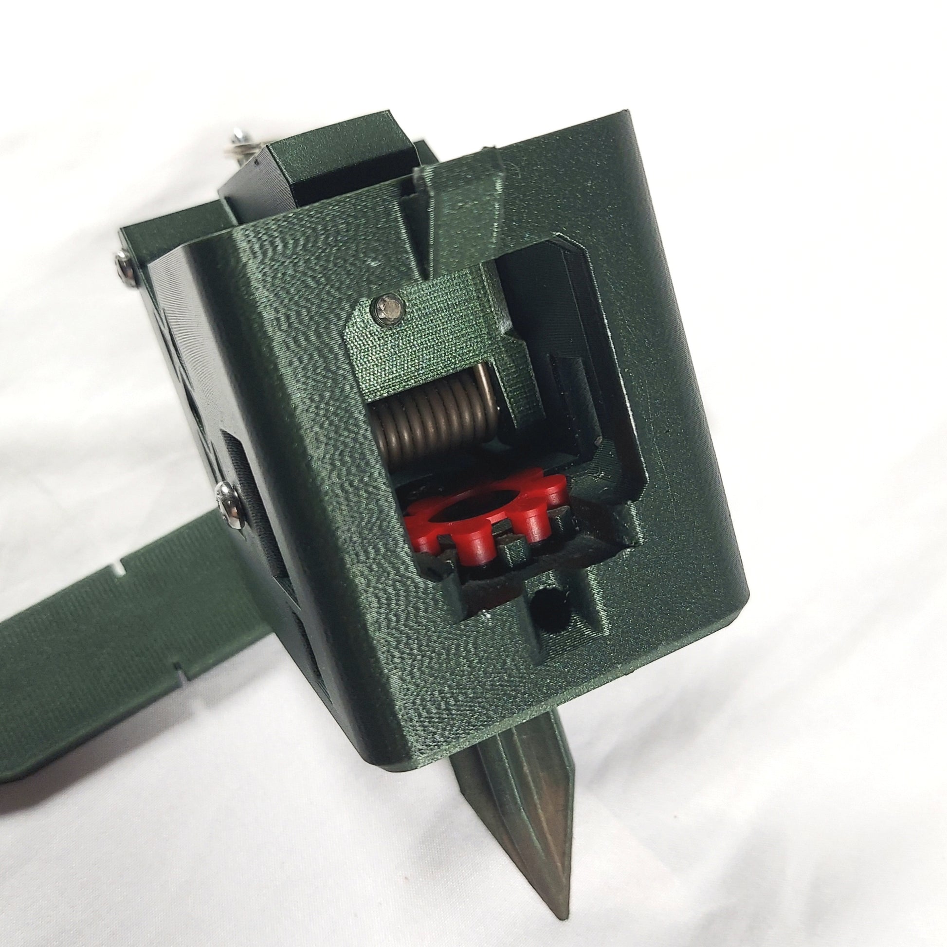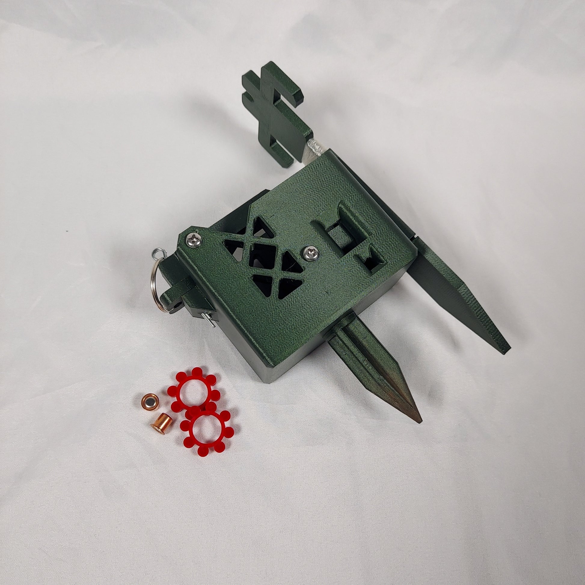 The 'MouseTrap' is our first tripwire-activated airsoft landmine. It primarily consumes 8-shot ring-caps used in toy cap guns to make a very loud bang, which are super cheap, reliable, and the same caps we use in our ThunderStrike V2 grenade. But not only does it use ring-caps, it can also use common .209 shotgun primers, making it compatible with two different kinds of ammo. And the most unique part of the mine is that it's fully powered by an actual mouse trap torsion spring, hence being named 'MouseTrap'. This allows for an ultra-compact and unique design, while delivering powerful performance. The system also features a break-away tripwire sear, eliminating safety hazards and physical damage to the mechanism.